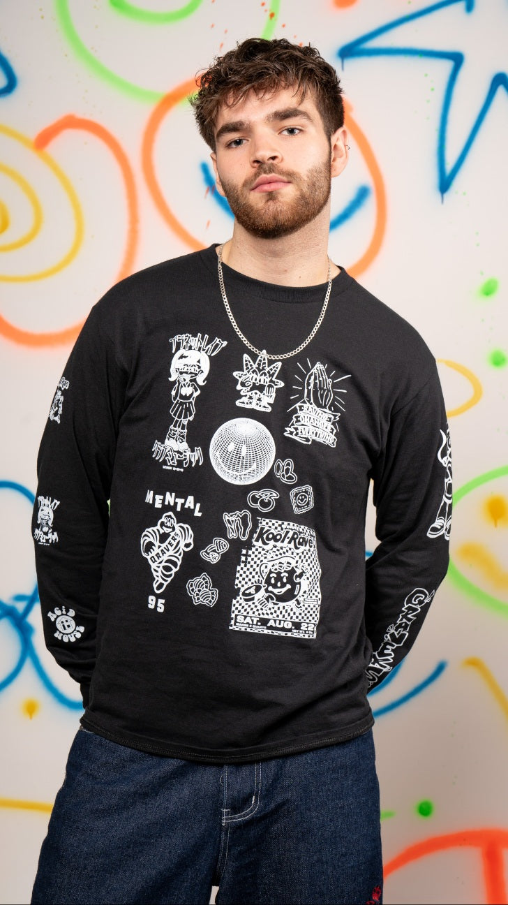 Bring a bold expression of rave inspired art to your wardrobe with the NEW Qravers Long Sleeve Tee. Featuring a striking double arm print, along with a unique collage of artwork from five renowned designers, this stylish tee is perfect for the ultimate rave-goer, offering durability, comfort, and a lightweight feel. An exclusive and elegant piece of 90s inspired rave wear available in four vibrant colourways