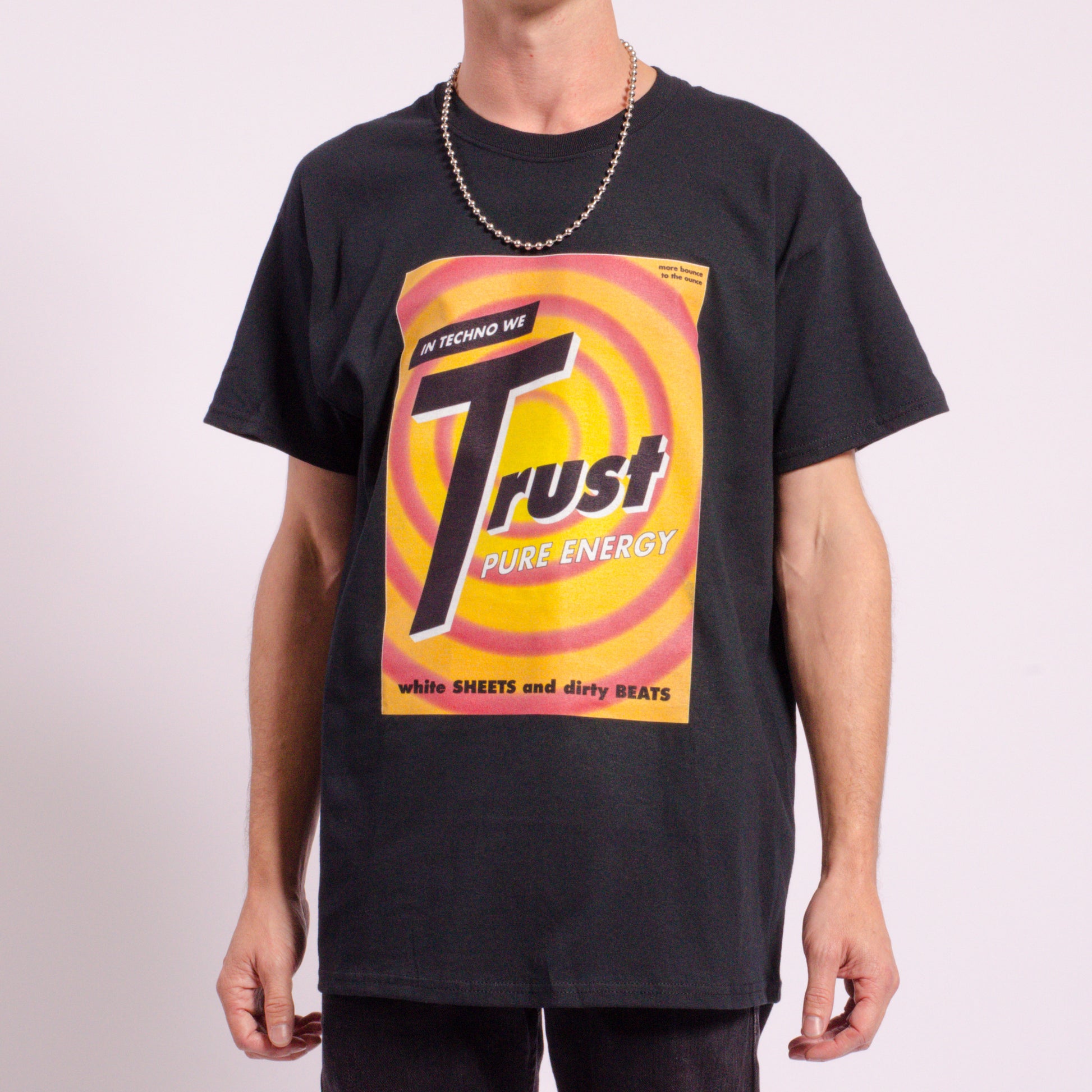 In Techno we Trust!, een door Qravers zelf ontworpen flyer gebaseerd op de originele Truth rave flyers uit de LA rave scene van begin jaren 90.