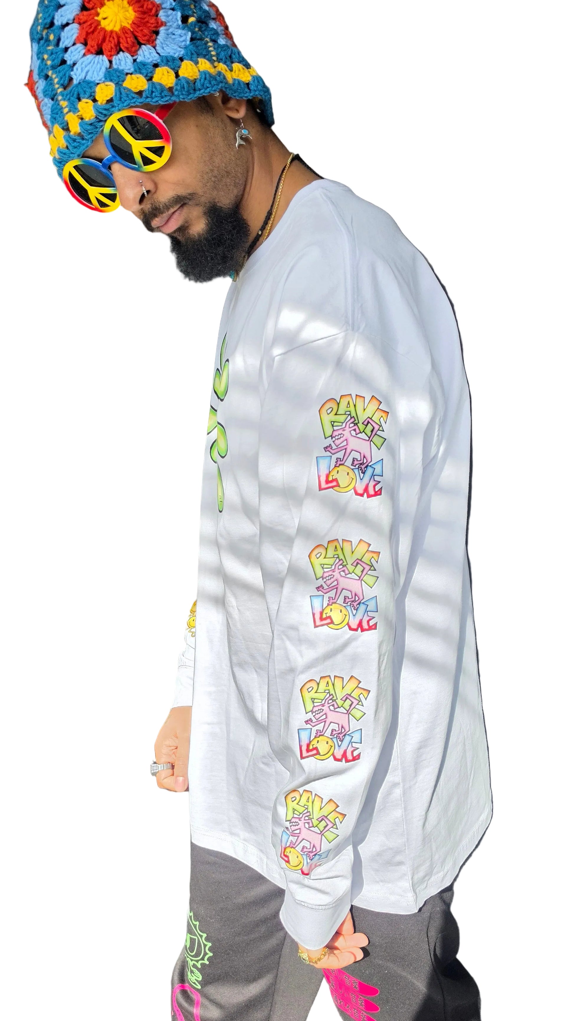 Rave Love artwork printed using our DTF Process for an extremely durable print. Direct to Film Transfers wash well and are flexible — they won't crack or peel, making them ideal for heavy use garms.